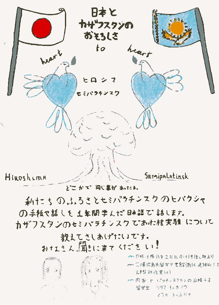 - 2月16日 留学生会館にて18:00よりカザフ留学生(リリア、マラル)によるカザフのヒバクシャについての報告会が行われました。