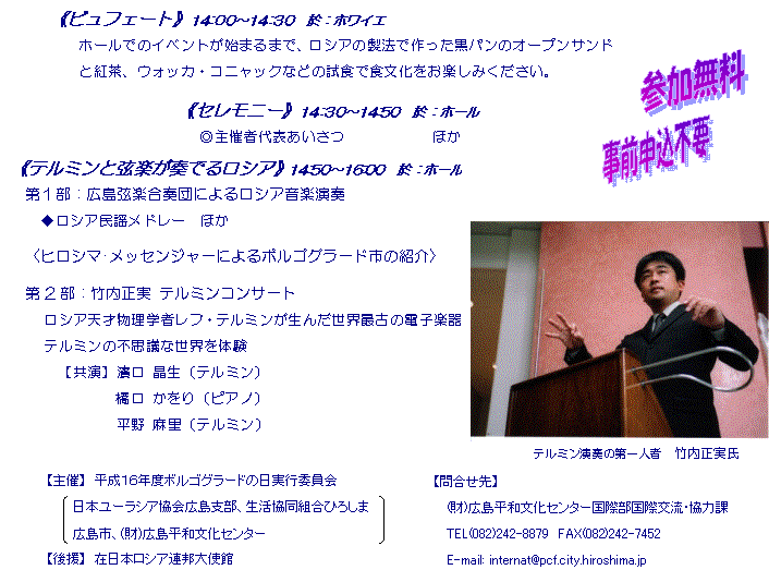 広島市には、6つの海外姉妹・友好都市があります。市民のみなさんにこれらの都市に親しんでもらおうと、平成13年に、都市ごとに「姉妹・友好都市の日」を定めました。「ボルゴグラードの日」はボルゴグラードの生誕記念日である9月第2日曜日(今年は9月12日)です。この日を記念して、広島市留学生会館で、イベントを行います。事前の申込みはいりません。ボルゴグラードそしてロシアに関心のある方、お気軽にご参加ください。